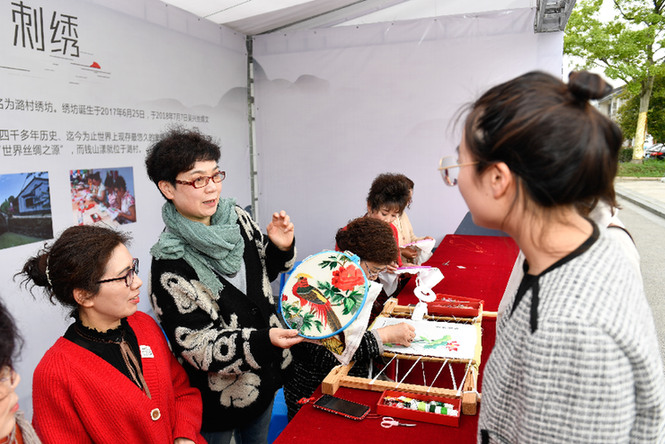 4月7日,吴兴区八里店镇潞村乡贤代表慎潺华(左二)向游客展示刺绣技艺。慎潺华号召村民组建了“潞村绣坊”,向游客展示传统手工艺。近年来,浙江省湖州市吴兴区八里店镇以乡情、亲情为纽带,把乡贤力量“聚”起来,探索开展乡贤助力、乡贤回归工程等活动,引导乡贤发挥积极作用,助力乡村振兴。 新华社记者 黄宗治 摄