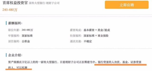 昨晚,“某特大型银行理财子公司”开出240万元-480万元的年薪招聘首席权益投资官的消息刷屏。