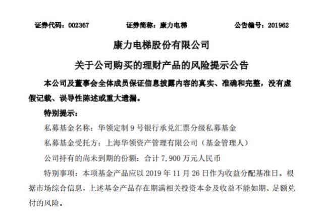 11月25日晚间,上市公司康力电梯发布公告称,近日根据市场综合信息,获悉公司投资的上海华领资产管理有限公司管理的“华领定制9号银行承兑汇票分级私募基金”最终可能存在期满相关投资本金及收益不能如期、足额兑付的风险。