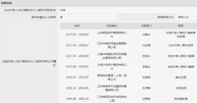 中国基金业协会网站公示,孙祺曾在多家资管机构任职,1996年8月-2001年10月曾在国际信托担任证券部总经理助理。
