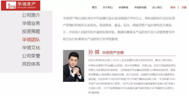华领资产官网上孙祺的职务是该公司总裁,部分公告中又称其为公司董事长。孙祺学历光鲜,拥有加州大学洛杉矶分校(UCLA)企业金融专业硕士研究生学历、复旦大学EMBA。