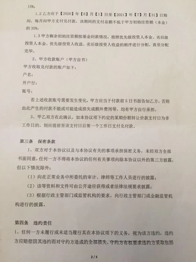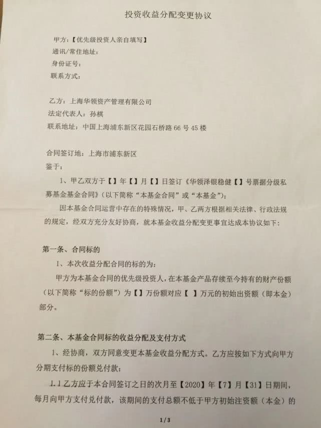 根据记者拿到的变更协议内容,“华领泽银稳健系列票据分级私募基金”采取延期兑付,至2020年7月31日期间偿付15%本金,往后一年再偿付35%本金,其余资金的兑付仍是未知数。