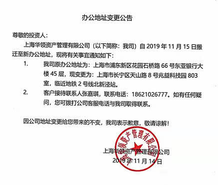 11月14日,华领资产突然挂出公告宣布搬迁办公地址,从上海浦东陆家嘴搬至长宁区。