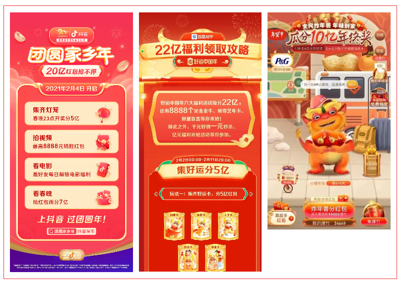 2021牛年春节进入倒计时,互联网巨头之间的红包大战正酣。目前,抖音、快手、支付宝、百度、京东、拼多多、腾讯微视等平台先后公布春节档的红包玩法,主要通过集福卡、组队互动、视频拜年、摇一摇、转发抽奖等活动来派发红包,红包总金额超过百亿元。