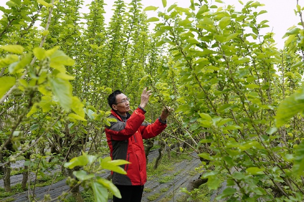 3月14日,在重庆市蚕科院蚕桑生态园内,技术人员蒋伟在查看果桑长势。