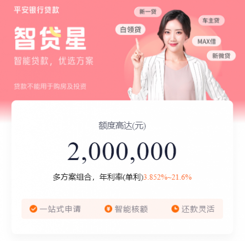 首先,对于那些平时征信就很好,怕麻烦,喜欢高质量便捷生活的朋友有福利了,平安银行贷款产品平安智贷星,它是纯线上申请、无抵押、无担保的信用贷款,不过贷款金额只能用于消费,这可以满足我们必须的一些日常消费。它的贷款依据是用户的信用度。这款产品对于用户的征信情况有一定的要求,如果用户的征信出了问题,则不能进行贷款。反之借贷人的信誉度越高,所获得的贷款额度也就越高。平安智贷星会根据个人的不同情况匹配合适的贷款方案,智能核额模式根据客户资质核算出符合客户准入的产品,大数据智能AI推荐模型推荐满足客户需求的贷款产品,两者相辅相成。根据申请者资质的不同,平安银行智贷星计算出不同的利率。平安智贷星是银行进行放贷的,放贷速度非常快,它采用线上审核模式,方便又快速,秒级审批,全流程最快15min。