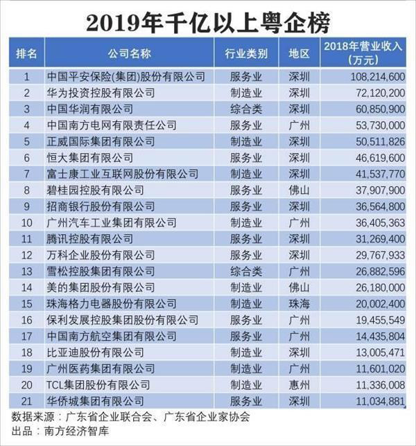 中国平安保险(集团)股份有限公司、华为投资控股有限公司、华润(集团)有限公司“C”位出道,位居广东企业500强前三位,2018年营业收入合计超过2万亿元。