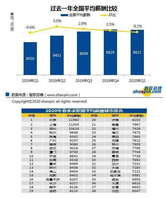 智联招聘2020年春季在线数据显示,全国38个主要城市的平均招聘薪酬为8821元/月,本季度平均薪酬绝对值环比下降0.1%,同比上涨9.6%。