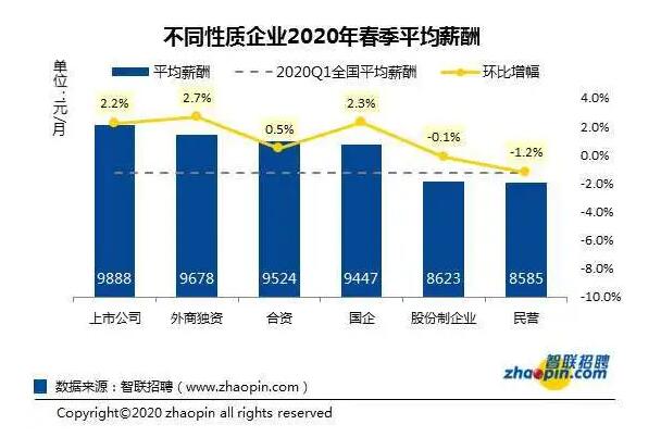 从企业性质看,上市公司薪资排名继续保持在第一位,平均月薪为9888元,环比上涨2.2%;其次是外商独资企业,平均月薪为9678元,涨幅为2.7%;再次为合资企业,平均月薪为9524元,环比上涨了0.5%;国有企业平均月薪为9447元,环比上涨2.3%。