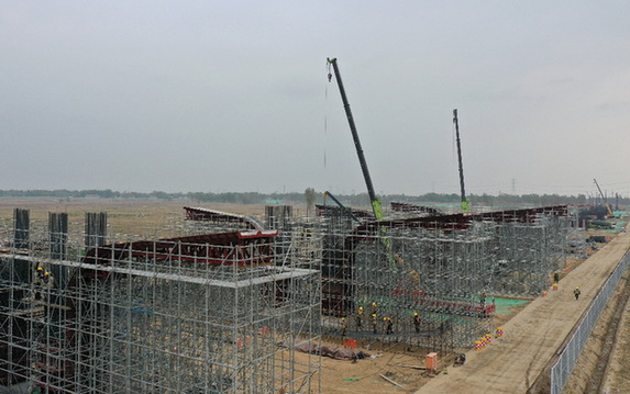 4月9日,中交一公局集团的工人在京雄高速兰沟洼特大桥建设工地施工(无人机照片)。