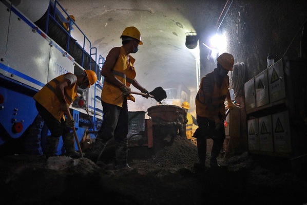 4月16日,中铁五局工作人员在隧道中施工。