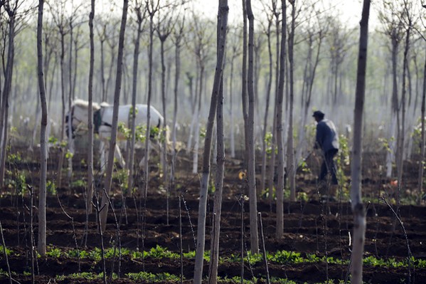 4月28日,在河北唐山遵化市新店子镇东苇店村,农民在管护苗木。