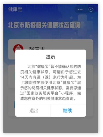 步骤一:进京后打开“北京健康宝”,在弹窗提示页面点击“继续”,进入“国家政务服务平台”进行查询。