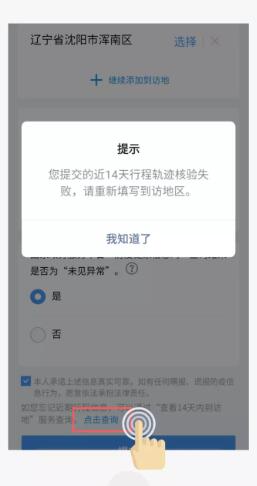 如果不确定14天到访地区或提示14天行程轨迹核验失败时,可点击页面底部提示中的“点击查询”进行确认,页面会跳转到“通信大数据行程卡”,即可进行行程查询。