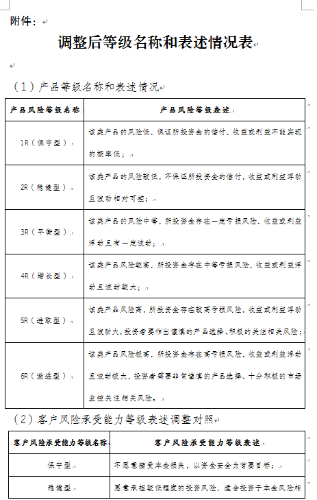 个人产品等级名称与等级表述调整对产品实际投资范围、投资比例等不产生影响,产品实质风险等级不发生变化;个人风险承受能力等级表述调整对客户实际风险承受能力不产生影响,客户的风险等级不发生变化。