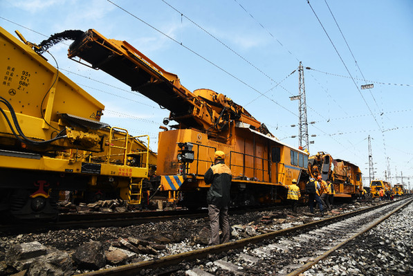 5月11日,中国铁路济南局集团有限公司济南工务机械段工人在施工现场工作。