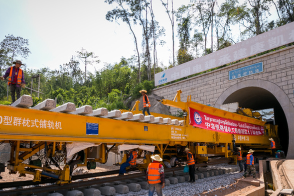 随着每排14根轨枕按照规定距离平稳铺过庚凯村隧道,500米长钢轨随着牵引机稳准落定,中老铁路铺轨23日通过第一座隧道,从老挝首都万象一路向北。