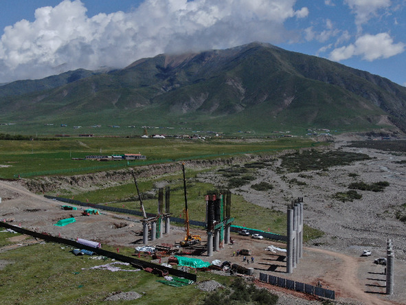 这是6月23日在青海省海北藏族自治州门源回族自治县拍摄的扁门高速老虎沟大桥建设现场(无人机照片)。