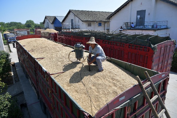 8月18日,江西省南昌县广福粮食管理所广福粮站的工作人员在运粮的货车上抽样准备进行检测。