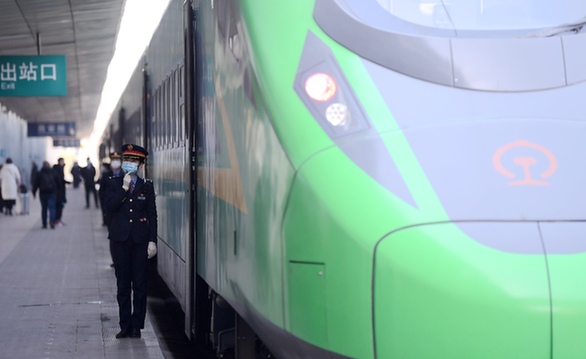 1月28日,工作人员在西安至渭南间首次开行的时速160公里“复兴号”动车组旁等候旅客。