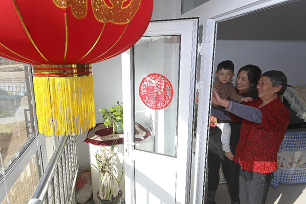 2月7日,张家口市万全区北新屯乡“空心村”安置户贺维果(右)和儿媳许敬娥在新居贴窗花。