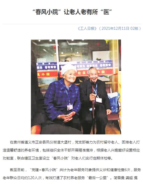 在贵州省遵义市正安县凤仪街道大堡村,党支部着力为农村留守老人、困难老人打造温馨舒适的养老环境,包括组织全体干部开展精准摸排,根据老人兴趣爱好设置相应功能室,联合辖区卫生室设立“春风小院”对老人们实行定期体检等。